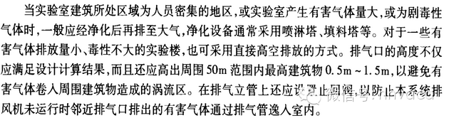 (9)實驗室排出的有毒和酸堿腐蝕性極強的氣體會對環境造成污染,在排入大氣前根據氣體的成分采取吸取、過濾等措施對其進行凈化處理,使排出氣體有害成分低于國家環保衛生要求。例如動物房的氣體經過粗效和中效過濾后,直接排入大氣,排出口應高出頂部3m以上。