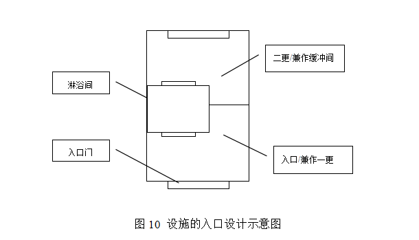 人員入口通常會考慮和淋浴、更衣間等結(jié)合設(shè)置。如果設(shè)施較大,男女人員的入口宜分別設(shè)置,可以減少等待時間。圖10是較常見的一種入口設(shè)計。