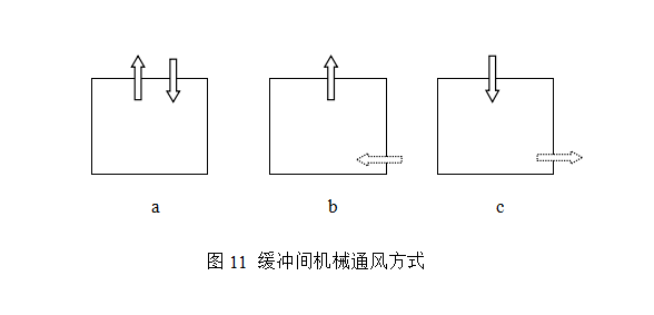 根據(jù)GB19489 《實驗室 生物安全通用要求》,緩沖間的定義是“設(shè)置在被污染概率不同的實驗室區(qū)域間的密閉室,需要時,設(shè)置機(jī)械通風(fēng)系統(tǒng),其門具有互鎖功能,不能同時處于開啟狀態(tài)”,即機(jī)械通風(fēng)可以視情況設(shè)置。雙門互鎖的房間是一個最基本的緩沖間,緩沖間的面積不宜過大,可結(jié)合更衣、淋浴、消毒等功能。緩沖間的機(jī)械通風(fēng)方式可以包括以下幾種方式(見圖11):