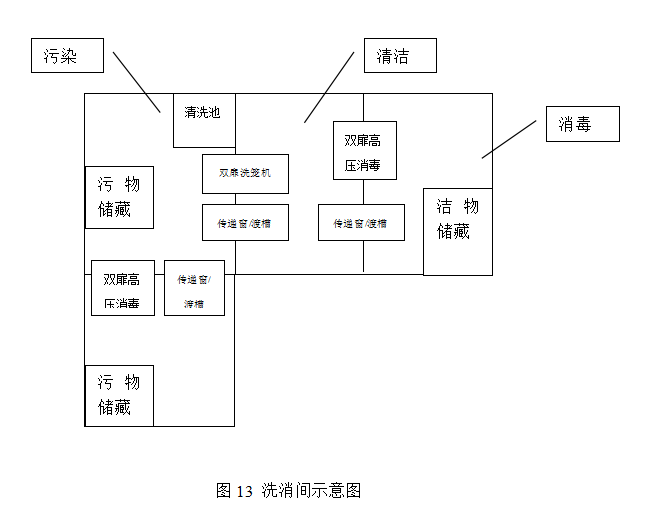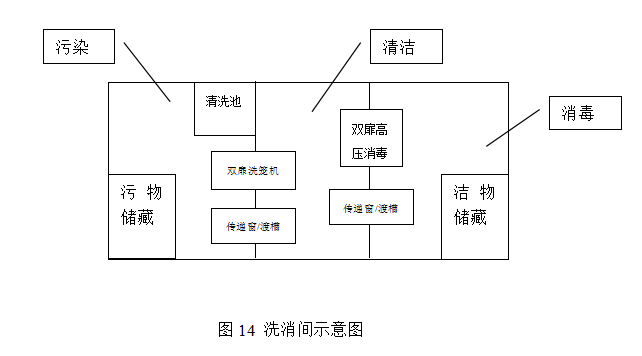 洗消間在動物設(shè)施中占有重要的地位。污染物可分為普通污染物和危險污染物,普通的污染物可以清潔后或進(jìn)一步消毒后再次使用,危險污染物須去除危險因子使之成為普通污染物后在進(jìn)行清潔和消毒。GB19489《實驗室 生物安全通用要求》規(guī)定,涉及高致病性病原微生物的污物或其包裝的表面須可靠消毒滅菌后運(yùn)出飼養(yǎng)間。意味著,一種布局方案是飼養(yǎng)間或風(fēng)險水平相同的通道等功能區(qū)與雙扉高壓鍋直接相連(見圖13),另一種方案是對污物進(jìn)行包裝,并對包裝的表面進(jìn)行可靠的消毒滅菌,然后運(yùn)出飼養(yǎng)間,但是,還須在防護(hù)區(qū)域內(nèi)進(jìn)行消毒滅菌處理,之后按普通的污物處理(見圖14)。當(dāng)動物籠具較多或較大的情況下,采取第一種方案更切合實際需求。近年來,洗消設(shè)備發(fā)展的趨勢是自動化和多功能化,如換籠工作站(見圖15),這些設(shè)備的安裝和對空間的要求要遵循制造商的建議,應(yīng)在設(shè)施的規(guī)劃期就要考慮,或預(yù)留出發(fā)展空間。