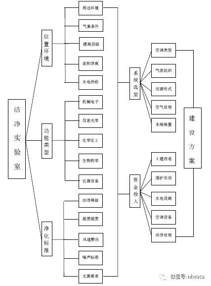 在選型實(shí)際中,人們往往會(huì)根據(jù)資金、能耗來選擇空調(diào)的類型,忽略了選型的根本是為了滿足需要,滿足凈化標(biāo)準(zhǔn)要求。在選型之前,一定要領(lǐng)會(huì)凈化實(shí)驗(yàn)室的用途和實(shí)驗(yàn)內(nèi)容、實(shí)驗(yàn)儀器設(shè)備、實(shí)驗(yàn)對(duì)象對(duì)空氣參數(shù)和環(huán)境要求的具體事項(xiàng),然后有的放矢地提出有針對(duì)性的凈化標(biāo)準(zhǔn),應(yīng)該考慮的內(nèi)容要包括:實(shí)驗(yàn)室的面積、樓層高度、實(shí)驗(yàn)室的總高度和凈化實(shí)驗(yàn)室圍護(hù)后的高度;希望達(dá)到的溫度、相對(duì)濕度、風(fēng)速、靜壓、靜壓差等;實(shí)驗(yàn)室內(nèi)要求的潔凈等級(jí)、噪聲標(biāo)準(zhǔn)、無菌要求等等,綜合考慮這些因素后,提出一個(gè)適宜的資金要求,從而確定空調(diào)通風(fēng)系統(tǒng)的具體形式和類型。整體建設(shè)潔凈實(shí)驗(yàn)室的過程如圖1-1方框圖所示。