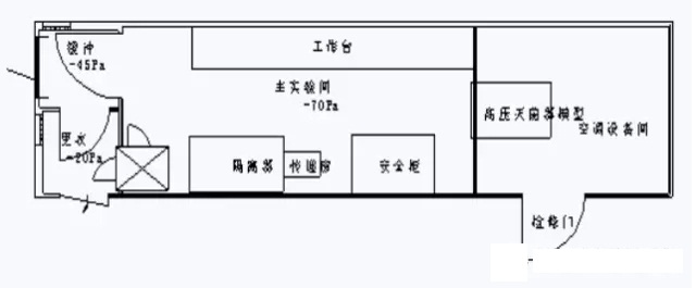 筆者參與了某P3生物實驗室的設計和調試工作,現在對有關設計和調試中出現的問題做初步探討。該P3生物實驗室總面積約為25m2,共一層,建筑高度為2.900m。如圖1所示該實驗室由主實驗間、緩沖間、更衣間、設備房組成。要求主實驗間保持負壓-70Pa,如圖1所示:壓力梯度從主實驗間向外依次增高。