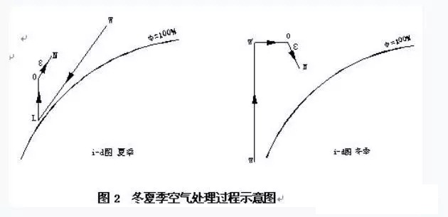 該空調系統應采用全新風系統,冬夏空氣處理過程如圖1所示。經計算某P3生物實驗室空調系統夏季所需冷量為19.66Kw,再熱量為1.61Kw,冬季所需熱量為16.01Kw,加濕量為7.08Kg/h。