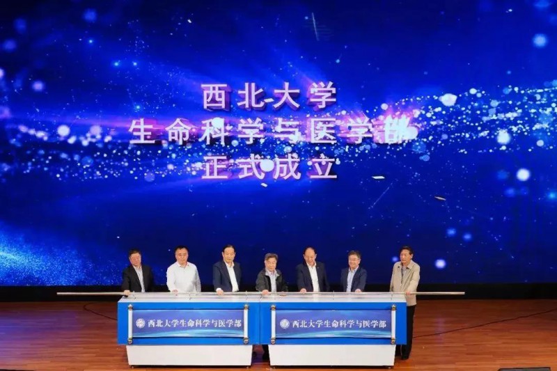 楊煥明、董小龍、強(qiáng)曉安、郭立宏、袁寧、陳昭、劉順智共同推動(dòng)啟動(dòng)桿,宣布西北大學(xué)生命科學(xué)與醫(yī)學(xué)部正式成立。