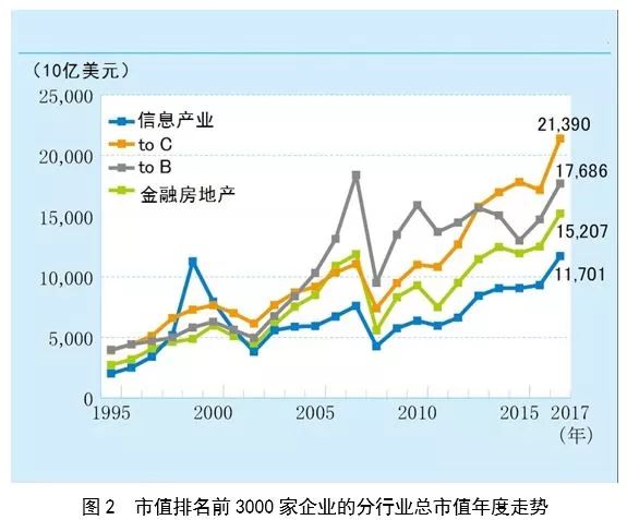 全球市值前 3000 家“頂級”企業(yè)的總市值在2008年雷曼危機(jī)后一度出現(xiàn)驟降,但自2009年重拾増勢,并在2012年后直線上漲。截至2017年年底,排名前 3000 位企業(yè)的總市值約為 66 萬億美元(詳見圖1)。然而,從不同產(chǎn)業(yè)的情況來看,市值增長則存在較大差異,其中也能夠看出各產(chǎn)業(yè)目前的現(xiàn)狀以及該產(chǎn)業(yè)未來期望值之間存在的差異。