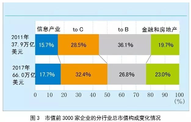 從上述 4 類行業(yè)的市值變化來看,截止2017年年底,信息產(chǎn)業(yè)、「to C產(chǎn)業(yè)」和金融房地產(chǎn)企業(yè)的總市值均增至2011年年底的約 2 倍,而且均超過同期平均水平(1.7倍)。而相比之下,「to B產(chǎn)業(yè)」僅增至 1.3 倍,遠(yuǎn)低于平均水平。從同時期 4 類產(chǎn)業(yè)的市值構(gòu)成變化來看,「to B產(chǎn)業(yè)」下降了 9.3 個百分點(diǎn),而「to C產(chǎn)業(yè)」增長了 3.9 個百分點(diǎn)。由此可見,「to C產(chǎn)業(yè)」在所有產(chǎn)業(yè)中的“存在感”明顯提升(詳見圖3)。