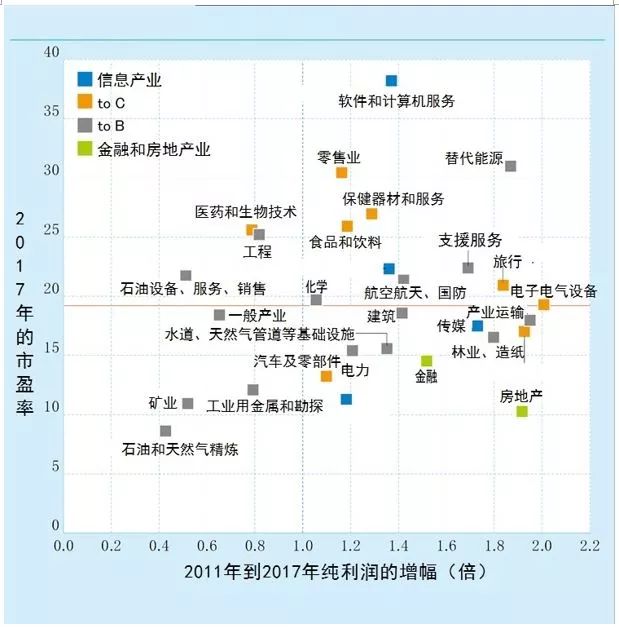 此外,從「to C產(chǎn)業(yè)」來看,“零售”和“醫(yī)療保健設(shè)備與服務(wù)”成為純利潤增幅較小但市盈率偏高的行業(yè),而“電子電氣設(shè)備”和“個人用品和家庭用品”則成為純利潤增長顯著但市盈率偏低的行業(yè)。從整個「to C產(chǎn)業(yè)」來看,截止2017年年底,企業(yè)的純利潤增至2011年的 1.3 倍、市值增至 2.0 倍、市盈率為 22.9,均高于全產(chǎn)業(yè)平均水平。