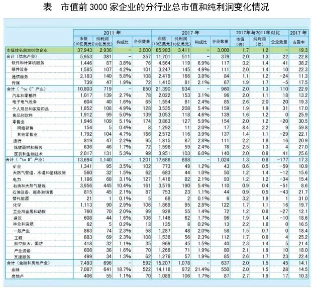 經(jīng)受了“雷曼沖擊”,全球 3000 家“頂級”企業(yè)的總市值從2009年開始觸底回升,截止2017年年底,3000 家企業(yè)的總市值已增至2011年的 1.7 倍。本文將這 3000 家“頂級”企業(yè)大致分為以下 4 個類別: