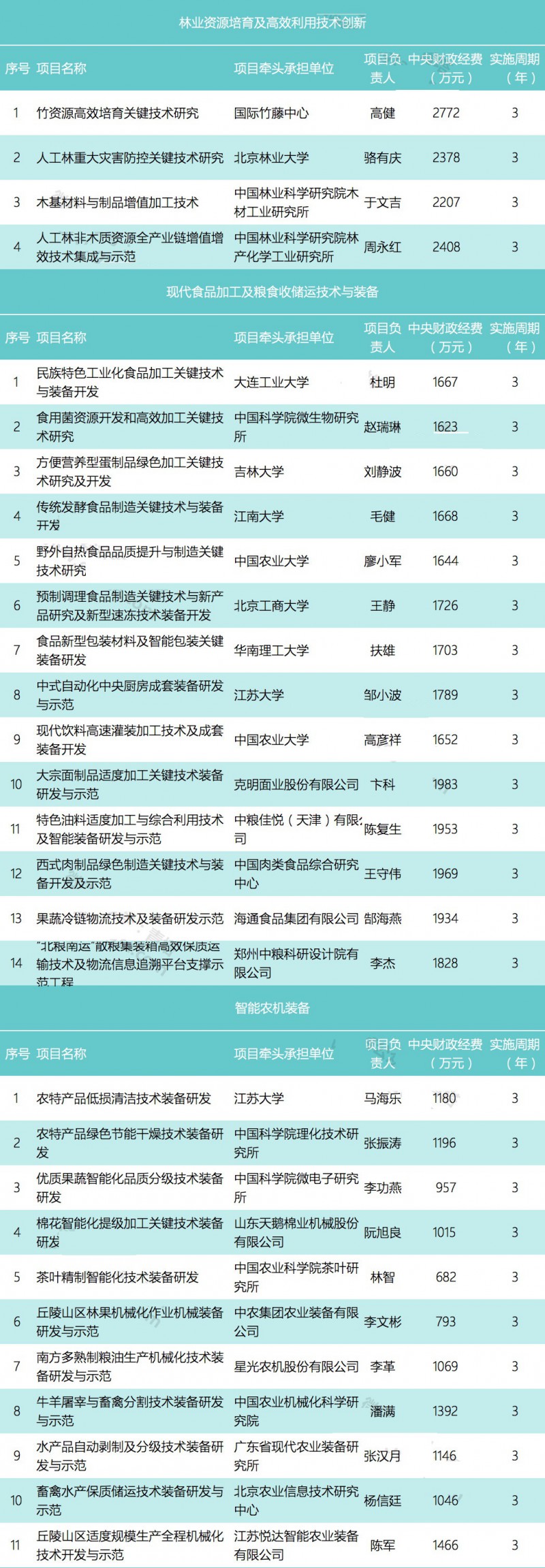 近日,科技部公示了5個國家重點研發計劃重點專項項目公示清單,分別是“七大農作物育種”、“畜禽重大疫病防控與高效安全養殖綜合技術研發”、“林業資源培育及高效利用技術創新”、“現代食品加工及糧食收儲運技術與裝備”和“智能農機裝備”,總經費超過9億元。