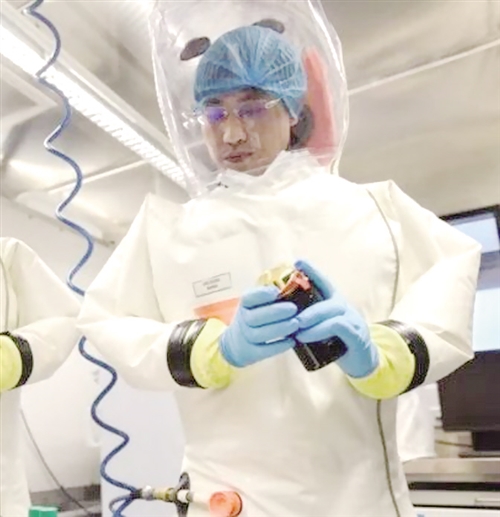 ▲身穿正壓防護服的科研人員在武漢P4實驗室進行適應性演練。