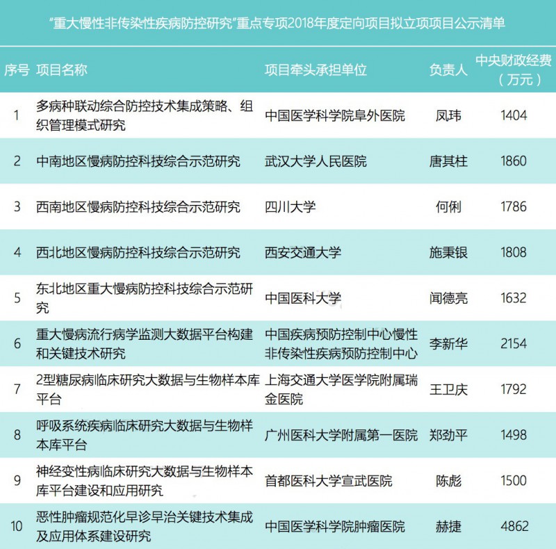 前,科技部公示了國家重點(diǎn)研發(fā)計劃“重大慢性非傳染性疾病防控研究”重點(diǎn)專項2018年度定向項目擬立項項目公示清單,擬立項項目總數(shù)共10個,總經(jīng)費(fèi)達(dá)到2.02億元。