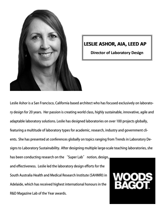 Leslie Ashor屬舊金山,加利福利亞常駐設計師,專注于實驗室設計超過20年。她的工作熱情來源于創造世界級的,可持續性最高的實驗室解決方案。Leslie已經設計了近100多個全球性的實驗室項目,所涉及的項目類型包括學院型,研究類的,工廠類和政府相關部門。她曾在全球性的大會上做過從實驗室設計趨勢到實驗室設計的可持續性發展的相關話題討論。在設計完成大型綜合性教學實驗建筑后,她開始主導關于“超級實驗室”的研究。Leslie在阿德萊德領導設計了南澳大利亞醫院研究中心,這在R&D雜志上年度實驗室頒獎中獲得了最高國際榮譽。