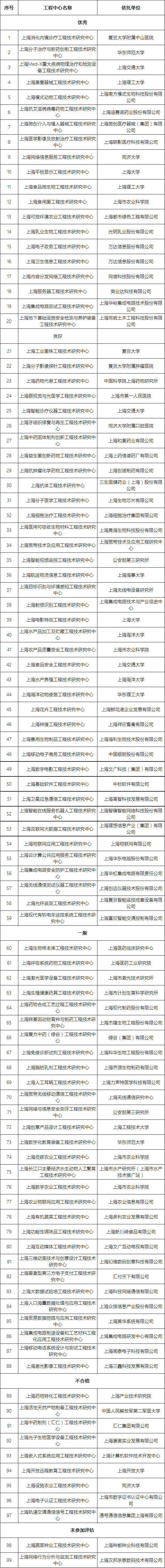 近日,上海科學技術委員會對通信、生物醫藥與農業領域的99家上海工程技術研究中心進行了評估,發現上海消化內鏡診療工程技術研究中心等20家工程中心評估結果為“優秀”,上海工業菌株工程技術研究中心等39家工程中心評估結果為“良好”,上海生物樣本庫工程技術研究中心等29家工程中心評估結果為“一般”,上海藥物轉化工程技術研究中心等9家工程中心評估結果為“不合格”(具體評估結果詳見下表)。