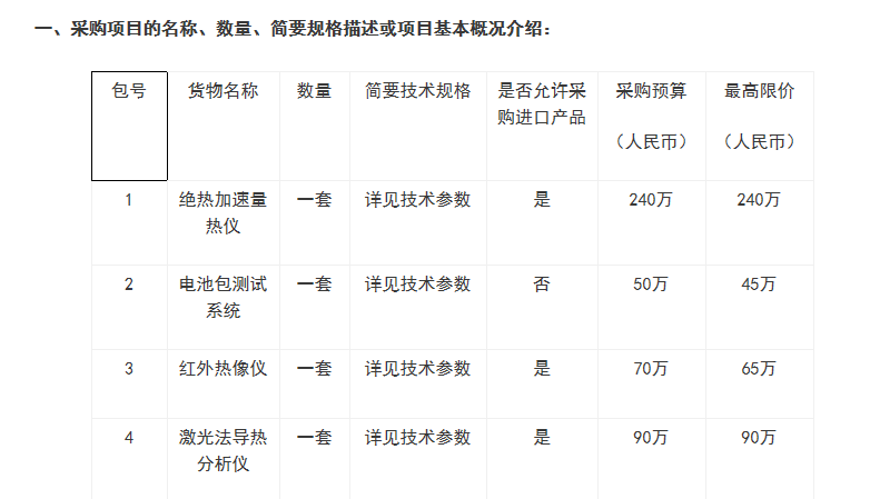 上述采購列表顯示,本次采購項目共四包,采購的儀器設備包括絕熱加速量熱儀、電池包測試系統、紅外熱像儀以及激光法導熱分析儀。據了解,熱像儀是利用紅外探測器和光學成像物鏡接受被測目標的紅外輻射能量分布圖形反映到紅外探測器的光敏元件上,從而獲得紅外熱像圖,這種熱像圖與物體表面的熱分布場相對應。而激光法導熱分析儀是采用一束激光照射樣品,用紅外檢測器測量樣品背面溫度的升高,來計算樣品的熱擴散系數的儀器。該儀器具有快速、方便的特點。