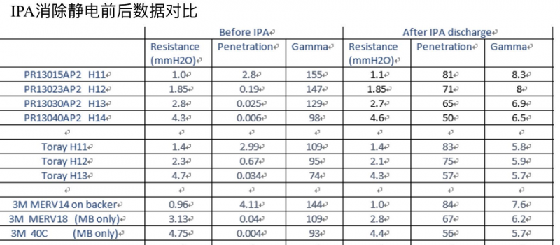 目前我們還是認為新冠病毒經呼吸道飛沫和接觸傳播是主要的傳播途徑。除了換氣量外,控制室內氣流分布與流向,空調專業稱為氣流組織,對于病毒飛沫傳播途徑有著重要意義。但各種指南卻沒有提及。由病人通過咳嗽、打噴嚏或說話而產生飛沫,粒徑較大,如果送風氣流由上而下可以加速飛沫的沉降、縮短傳播距離。這里可以借用編制GB 51039-2014《綜合醫院建筑設計規范》時考慮的控制飛沫傳播的二條措施: 一是上送下回的氣流組織;二是在管住空調系統的回風口。為了增強室內換氣量以稀釋污染,有些指南要求增設室內空氣凈化器,本意是好的,如果干擾了通風空調系統的送風氣流,擾亂了原來設定的氣流組織,不利于加速飛沫的沉降、縮短傳播距離。而且大多室內空氣凈化器的空氣過濾器,其末端配置號稱是H13的高效過濾器。其實這些過濾器使用的是駐極熔噴濾材,增強了靜電效率而阻力很低,以彌補凈化器內置風機壓頭偏低。如根據ISO 16890-4的測試標準,要求空氣過濾器在測試前需用IPA (ISO-Propyl-Alcohole)試液對過濾器或過濾單元進行消除靜電處理。從下表可以看出H13空氣過濾器在消除靜電前后其穿透率(Penetration)差異有多大。