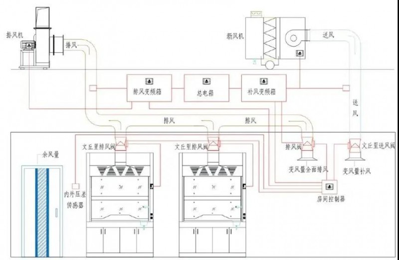 通風系統不僅對實驗室通風柜有特殊要求外,還對控制系統和其他設備有一定的要求和標準。設備型號、通風系統設計和控制系統都會影響到實驗室的壓力控制和最小通風量的控制,通風系統設計和控制系統最主要。通風系統不平衡會導致通風柜排風和捕捉能力散失,氣流流出實驗室,建筑物內壓力不穩定。