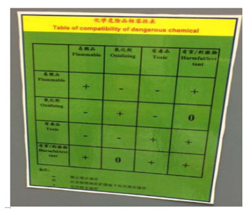 同時,我注意到人家的標識,參見上圖的“必需戴防護眼鏡”(這只是其中的一個小地方),已經細化到一點一滴,好多意想不到的地方都有,包括提示性的,警示性的,甚至像“化學危險品相容性表”等指導性意見都有,這樣經常看見,我覺得安全操作意識不自覺地也提高了。