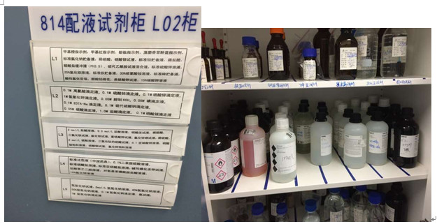 找試劑是QC人員試驗中浪費時間地方之一,若能快速的找到所需試劑,就能節約時間,提高效率。試劑柜門上不僅有一個目錄,明確標明每層放置的試劑名稱,而且里面均對區域進行劃分,每一行只放相同試劑,一種試劑一行,剩下多少也一目了然。