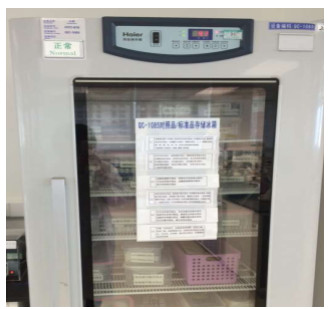 備注:該冰箱里全部是未開啟的對照品,旁邊一個冰箱里全部是開啟的對照品。冰箱門上貼的是對照品信息,包括每一層放置的藥品名稱。