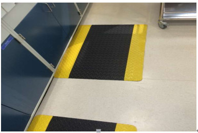 洗消室,通風櫥等需長時間站立且容易有水的地方均鋪有防滑防疲勞的墊子。交流得知,該墊子可防止因長時間站立的疲勞,這樣可以不僅提高效率,并且防滑,比較安全。