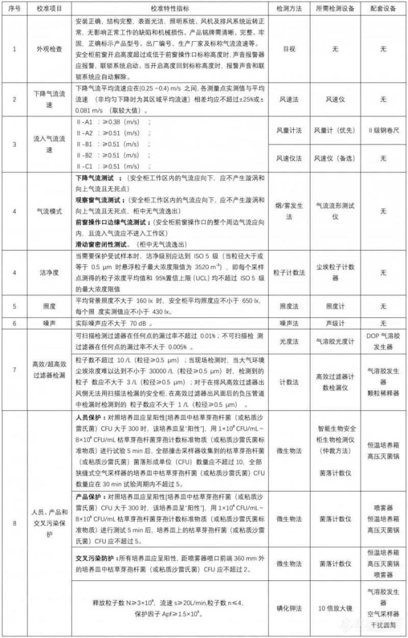 關(guān)于JJF1815-2020 《Ⅱ級生物安全柜校準(zhǔn)規(guī)范》中規(guī)定的計量特性、對應(yīng)指標(biāo)、相關(guān)方法及對應(yīng)儀器設(shè)備,匯總見下表2。