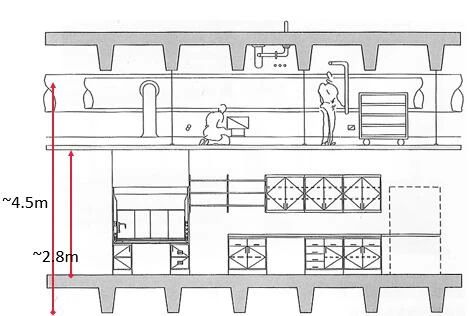 整個醫學實驗室主要是貼面上的管網非常復雜,吊頂內多涉及到排風、補風、回風,空調水等,同時保證正常的安裝檢修空間,建議醫學實驗室建筑層高不宜低于4.5m,否則雖然照顧了上面的檢修,但是下面的使用空間又會減少。