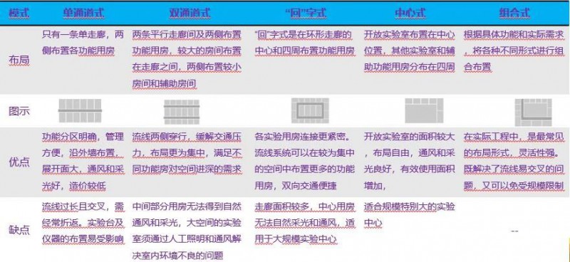 醫學實驗室常用的布局有多種,包括常見的單通道式、雙通道式、“回”字式、中心式、組合形,每種形式都有它的優缺點。其中中心式的開放實驗室的面積較大,不均自由、通風和采光良好,有效使用面積增加,適合規模特別大的實驗中心。但是實踐過程中最靈活的還是組合式,這種組合式的功能布局都比較靈活,既解決了流線易交叉的控制,又解決了規模的限制。