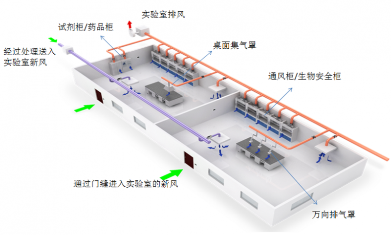 整個實驗室最重要的還是要做好通風空調系統,它是影響最廣泛的系統之一。整個通風系統完善與否,直接對實驗室環境、實驗人員的身體健康、試驗設備的運行等方面都產生重要影響。通風空調系統設計與施工核心指標是實驗室壓力、換氣次數和溫度,這幾方面是要重點考慮的。