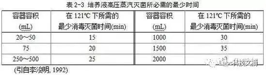 使用高壓蒸汽滅菌器滅菌時,將分裝好的培養液放入底部有一定量(淹沒加熱管)涼水的高壓蒸汽滅菌器內,增壓至0.35~0.4 kg/cm2時排凈滅菌器內冷空氣,以便使蒸汽能到達各個消毒部位,保證消毒滅菌徹底。然后繼續加壓加熱,當壓力表讀數達到1.0~1.1 kg/cm2為121 ºC,保持15~20 min即可。由于消毒滅菌效果取決于溫度而不是壓力,所以在一定壓力下保持較長的消毒滅菌時間是必須的。在121 ºC的蒸汽溫度下可以很快殺死各種細菌及高度耐熱的芽孢桿菌,因此許多培養液的消毒滅菌壓力、溫度一般保持在1.0~1.1 kg/cm2、121ºC。消毒滅菌時間與需要消毒滅菌的培養液量密切相關(表2-3),時間不足達不到滅菌效果,時間過長培養液內的一些化學物質遭到破壞,影響培養液成分。