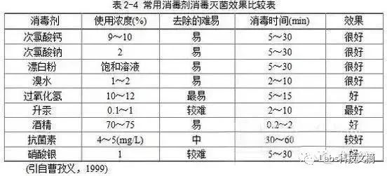 用于那些不能利用物理方法進行滅菌的物品、空氣、工作面、操作者皮膚、某些實驗器皿等。常用的化學消毒劑包括甲醛、高錳酸鉀、70%~75%乙醇、過氧乙酸、來蘇爾水、0.1%新潔爾滅、環氧乙烷、碘伏或碘酊等。其中利用70%~75%乙醇、0.1%~0.2%氯化汞、10%次氯酸鈉、飽和漂白粉等進行實驗材料的滅菌;利用甲醛加高錳酸鉀[(2 mL甲醛+1g高錳酸鉀)/m3]或乙二醇(6mL/m3)等加熱熏蒸法進行無菌室和培養室的消毒。在使用時應注意安全,特別是用在皮膚或實驗材料上的消毒劑,須選用合適的藥劑種類、濃度和處理時間,才能達到安全和滅菌的目的。