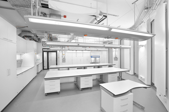 在裝修時(shí),因彩鋼板重量輕、機(jī)械強(qiáng)度高、防水及保溫性能比較好,所以CEIDI西遞會(huì)采用聚苯乙烯夾心彩鋼板作為P2實(shí)驗(yàn)室的吊頂及圍護(hù)隔斷材料;在墻面與地面,墻面與頂面之間的夾角,則會(huì)用鋁合金圓弧陰陽過渡及密封。此外,為了避免長期實(shí)驗(yàn)導(dǎo)致鋁材氧化,CEIDI西遞的所有配套鋁合金型材均采用電泳型材;實(shí)驗(yàn)室的地面也會(huì)采用具有耐酸堿腐蝕、抗磨損及防滑等特點(diǎn)的進(jìn)口塑膠PVC地板無縫連接。
