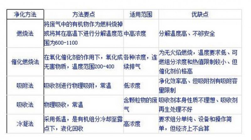 炭氫化合物(HC)是污染大氣的重要污染物之一,其中包括簡單的有機化合物。目前對于氣態有機物污染物種類繁多,采用的治理的方法也有多種,常用的有:吸收法、吸附法、催化燃燒法、燃燒法、冷凝法等。這些方法應用中各有特點和利弊,需要根據污染程度、使用環境與條件來權衡。對于環保檢查機構和污染治理方所共同關心的是:初次投資費、運行費用、二次污染、處理效果、維護等方面的問題。簡而言之這些方法均能滿足一定條件下氣態污染物的處理。對于以上各種方法的適用范圍以及特點敘述入如下圖