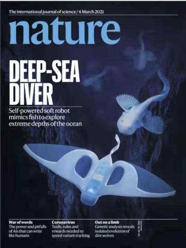 不久前,國際頂級期刊《自然》雜志在封面刊發的一項科技成果——仿生深海軟體機器人。這個機器人長22厘米,翼展寬度28厘米,大約為一張A4紙的大小,形似一條魚。它實現了機器人無需耐壓殼保護,便可承受深海萬米級的靜水壓力。