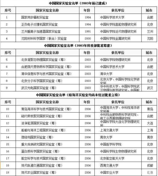 其中包括,國家同步輻射實驗室(合肥)、正負電子對撞機國家實驗室(北京)、北京串列加速器核物理國家實驗室(北京)、蘭州重離子加速器國家實驗室(蘭州)沈陽材料科學國家(聯合)實驗室(沈陽)以及青島海洋科學與技術國家實驗室(青島)。