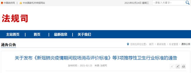 核心提示:《新冠肺炎疫情期間現場消毒評價標準》  關于發布《新冠肺炎疫情期間現場消毒評價標準》等3項推薦性衛生行業標準的通告  現