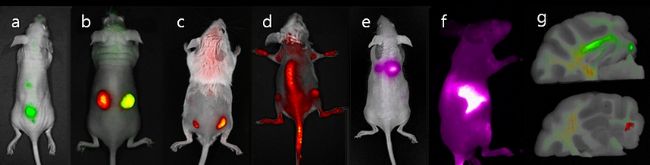 利用藍(lán)色,綠色,紅色和NIR四個(gè)通道,可對大多數(shù)熒光蛋白和熒光材料進(jìn)行成像。FOBI在一個(gè)樣本中可以對多個(gè)熒光信號進(jìn)行采集,例如可以在同時(shí)觀察活體動(dòng)物體內(nèi)腫瘤的生長及藥物的分布。FOBI還可快速合并明場和熒光圖像,定位動(dòng)物中的熒光。