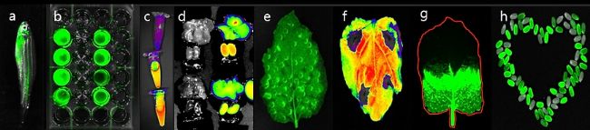 FOBI可以對GFP標(biāo)記的植物葉片進(jìn)行成像。由于葉綠素的強(qiáng)自發(fā)熒光,植物葉片難以獲得圖像。FOBI配置有專去葉綠素自發(fā)熒光的濾光片,并可對GFP的信號進(jìn)行采集。同時(shí),葉綠素本身的自發(fā)熒光也可用作實(shí)驗(yàn)數(shù)據(jù),葉綠素的活性程度可以通過自發(fā)熒光的強(qiáng)度來確定。此外,可以從植物種子和愈傷組織獲得熒光圖像。