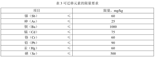 5.3.1產品表面涂層可遷移元素的限量應符合表3的要求。