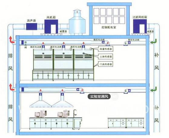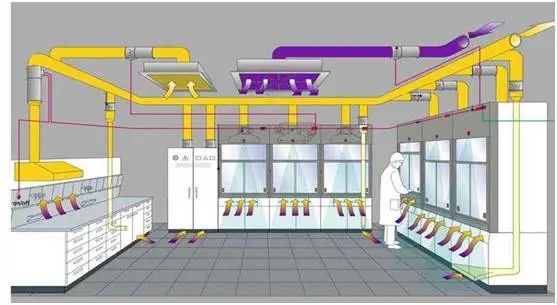 實驗室通風系統一般由送風系統和排風系統組成,包括送/排風設備、送/排風管道系統(包括送/排風控制設備等)、消聲器、過濾設備、可能的隔離防護設備、風機、控制系統等等。