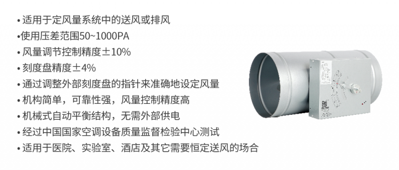 在氣流通過閥片時,氣囊、彈簧及控制機構產生阻尼與平衡作用,從而實現恒定的風量控制,適用于送風或排風系統。