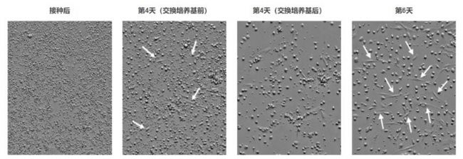 使用補充了10%胎牛血清(FBS)和1%青霉素鏈霉素的Iscove改良Dulbecco培養基(IMDM),將市售人骨髓細胞以950,000個細胞/0.5ml/孔的密度接種在24孔板(Sumitomo Bakelite,目錄號MS-80240)上。使用CM20系統每小時對細胞進行一次自動聚焦成像。由于在培養的第4天觀察到粘附細胞的增殖,因此在更換培養基后對其進行長達6天的監測。
